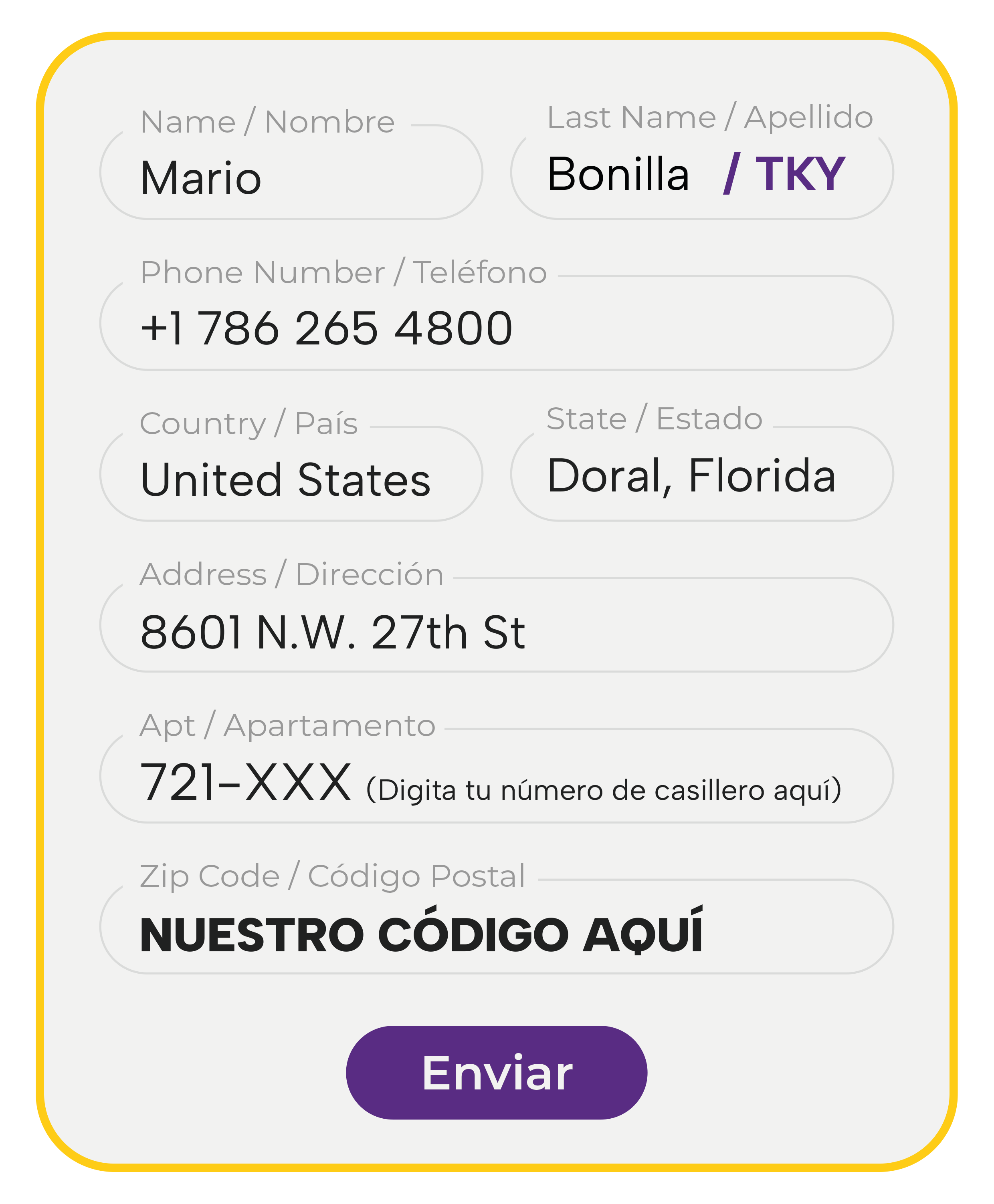 Incluye estos datos en tu pedido para que llegue a nuestra bodega en Miami.